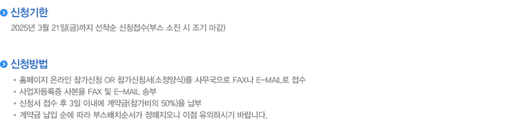| 독립부스 | 1 Booth (3m × 3m = 9㎡) | 국내 : 2,100,000원 해외 : $2,700 |